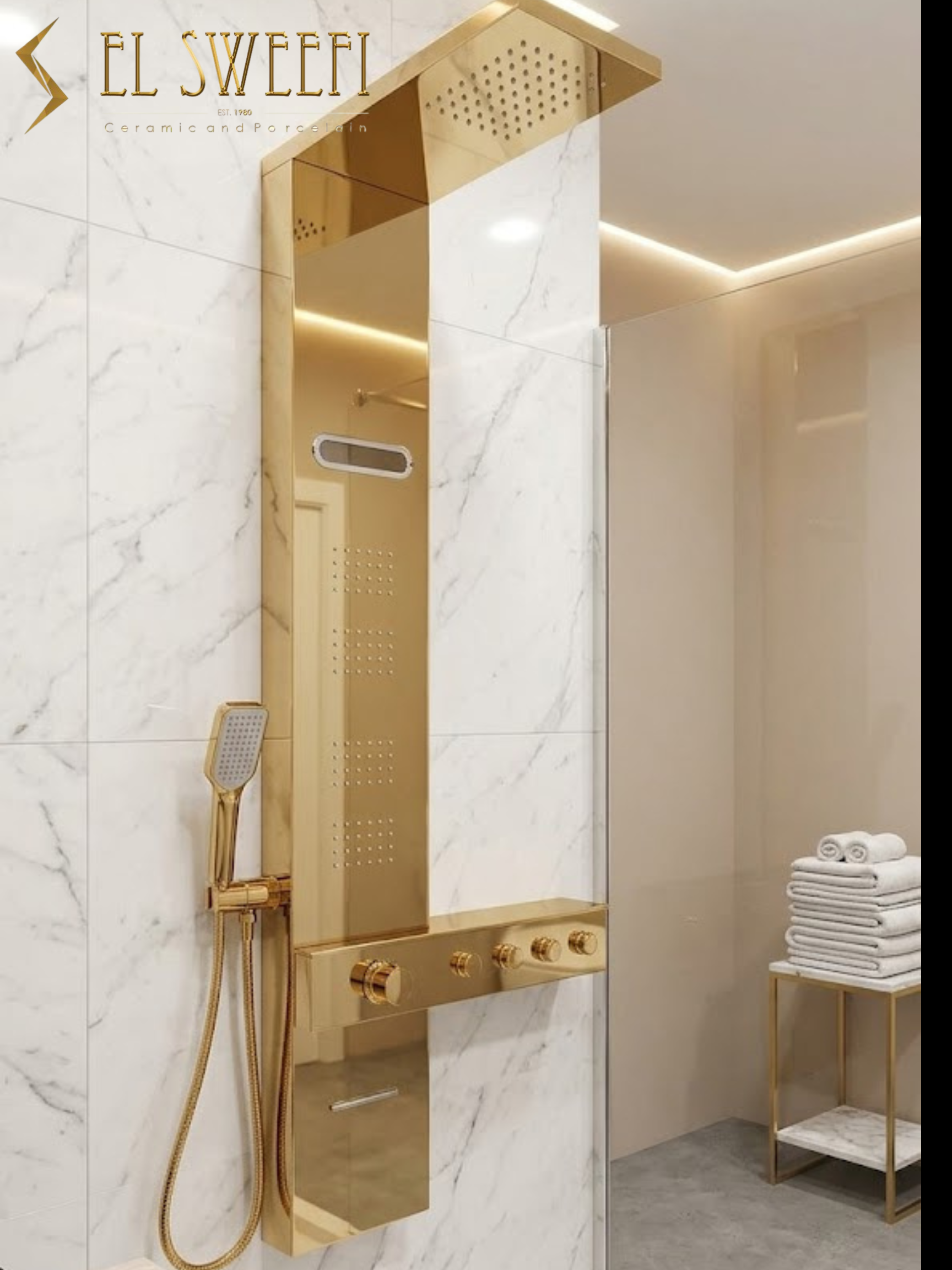 • شاور بانل 600 مضيئة بشاشة ديجيتال بمجموعة جيت علوى و عدد 2 مجموعة جيتات خلفية وسماعة بالخرطوم والمحول اللون ذهبى منتج مستورد EGP 3300